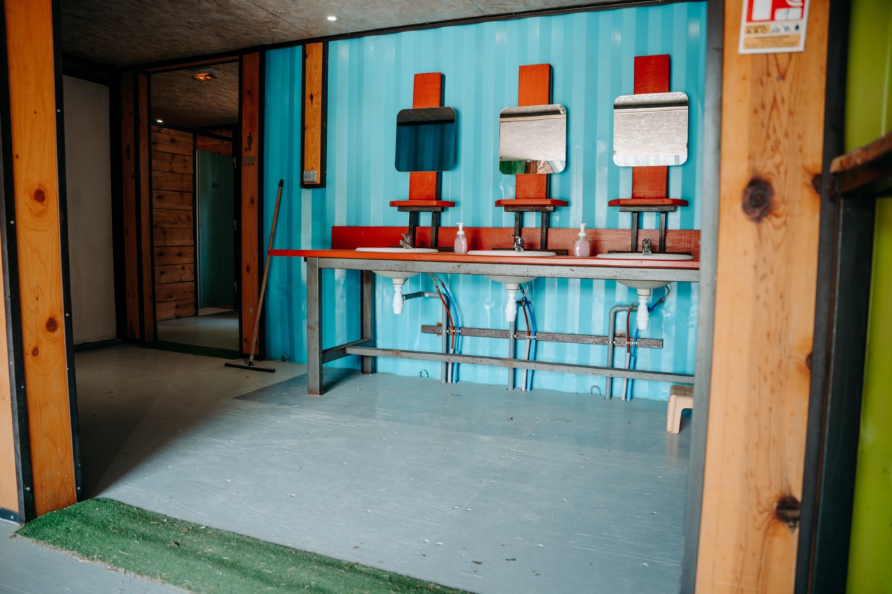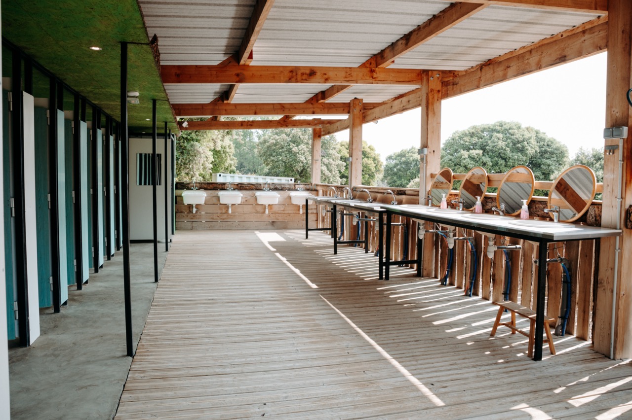 2 espaces séparés composés chacun de 5 toilettes et 4 douches. 1 espace PMR (personne à mobilité réduite).